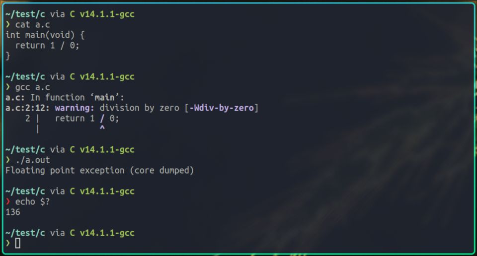然后,我们用gcc编译这段代码,在编译时,gcc其实已经给我们警告了,告诉我们除以0了,但我们先不管。