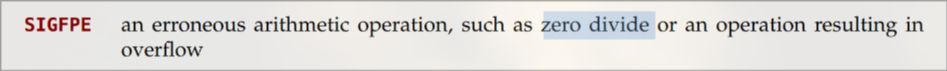 SIGFPE表示的是要发送这个信号给产生异常的进程,注意这个信号,和上文中我们提到的,c语言规范里定义的要发送的信号是一致的。