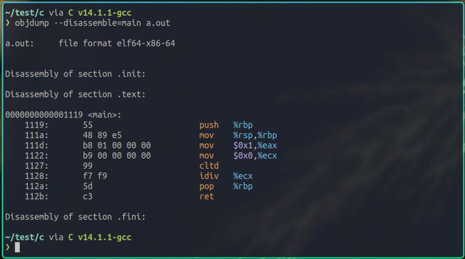 上图中,我用objdump命令反汇编了main函数,从输出我们可以看到,除法在汇编层面使用的是idiv这个汇编指令。