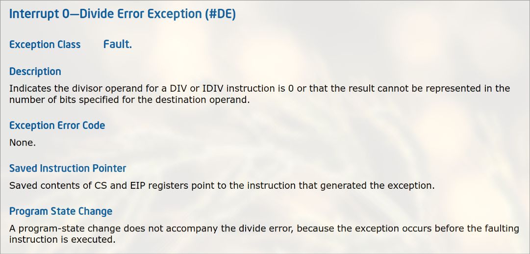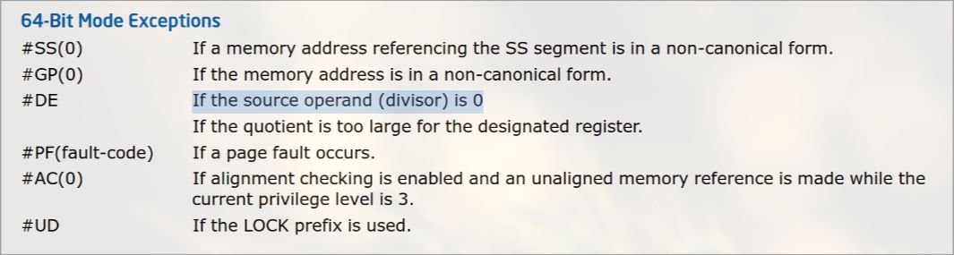 在这个汇编指令对应的文档中,有一部分介绍了它可能产生的各种异常,见上图,从中我们可以看到,当除数是0时,会产生#DE这个异常。