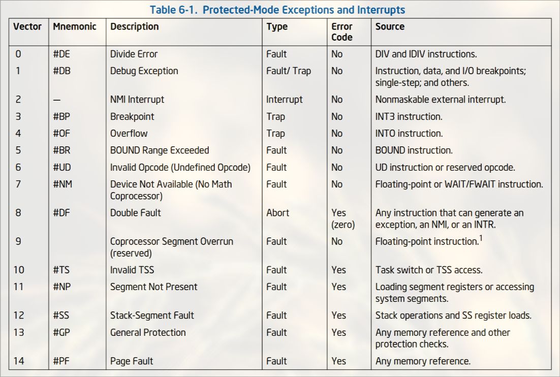 上图就是x86体系cpu预定义的部分异常,其中vector列就是该异常对应的编号,比如我们常见的page fault异常,它的编号就是14,以及我们在找的#DE异常,或者说是divide error异常,它的编号就是0。