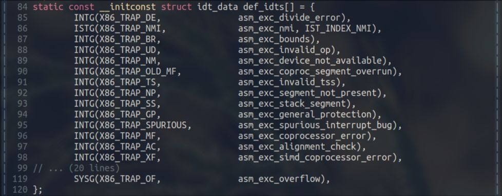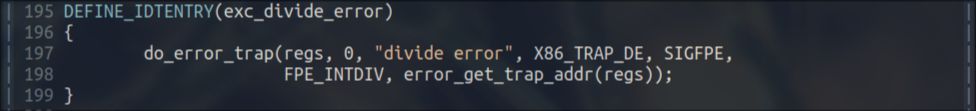 通过上图我们可以看到,#DE异常对应的编号是由X86_TRAP_DE定义的,而这个值如果你去看一下,会发现就是0,这个和我们上面通过文档获取的信息是一致的。