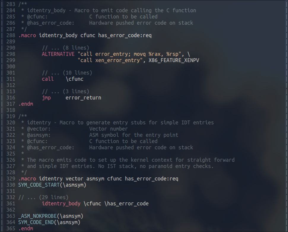 这个函数是在arch/x86/entry/entry_64.S文件里,由idtentry这个宏定义的一段汇编代码:
