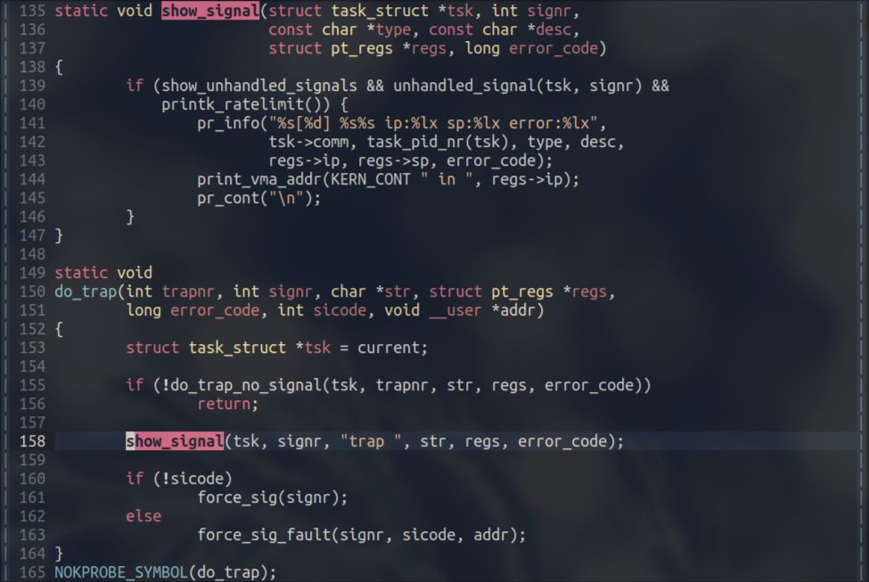 我们看show_signal这个函数,在这个函数内部,输出了一行内核日志,也就是说,当我们执行上面的测试程序时,应该是有一条对应的内核日志的,我们查看下。