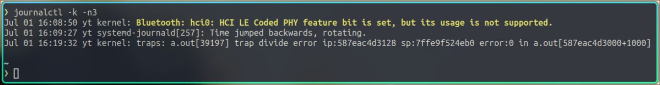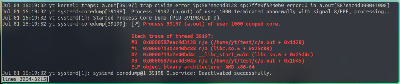 看上图中的第一行日志,它是内核输出的除0异常的一条日志,这个上面我们也看过,注意它和systemd-coredump写的core dump日志是在相邻位置。