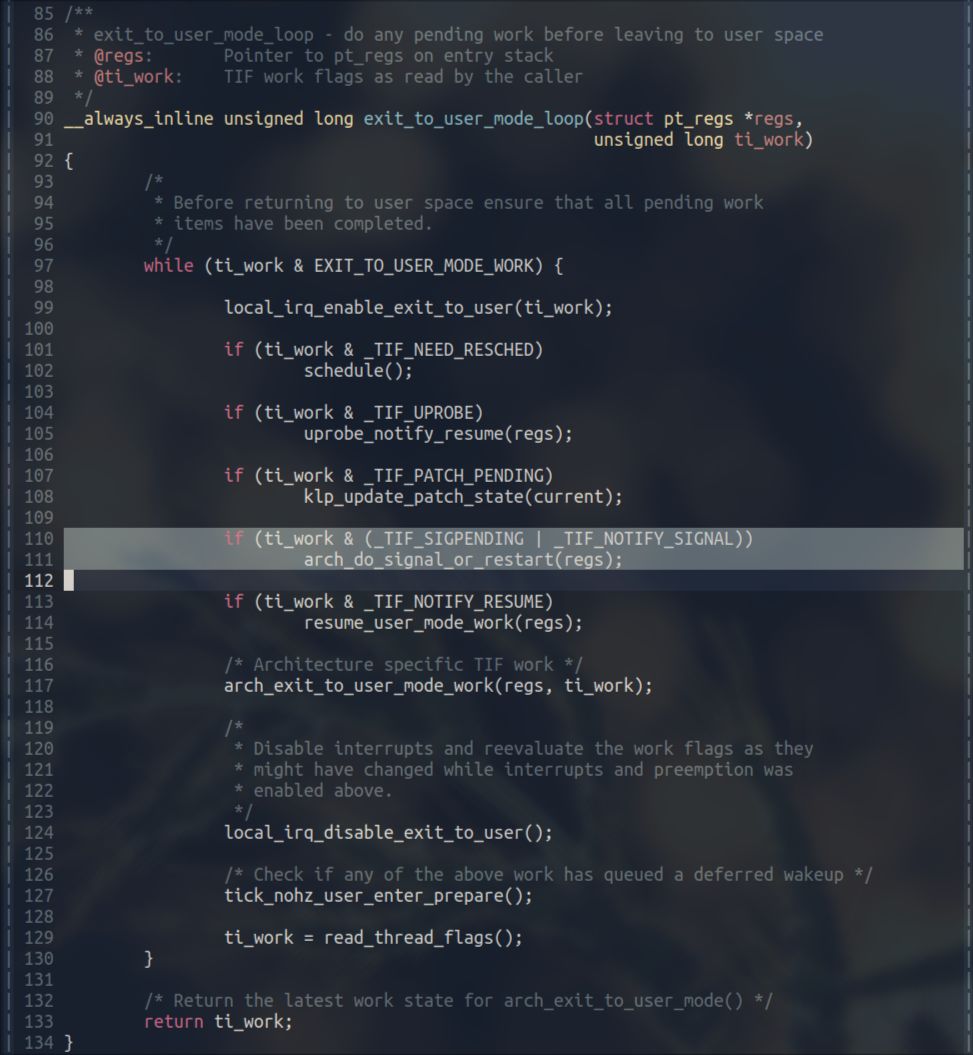 看上图中的选中行,就是在检查当前进程是否有未处理的信号,如果有的话,就调用arch_do_signal_or_restart函数来处理。