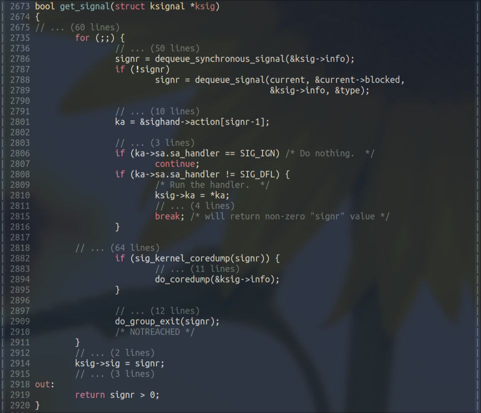 这个函数使用for循环,不断的从当前进程中获取未处理信号,该信号值放到了signr变量里。