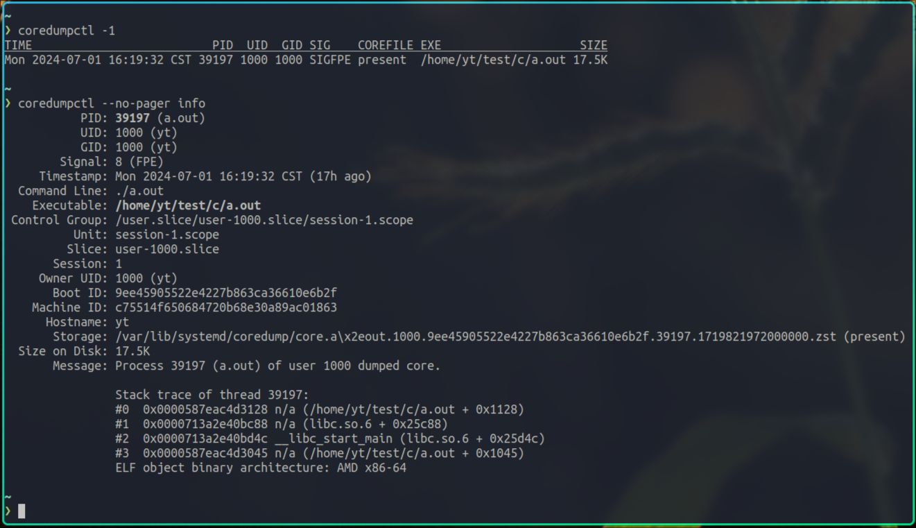 我们可以用coredumpctl命令,来获取这个core dump文件的各种信息: