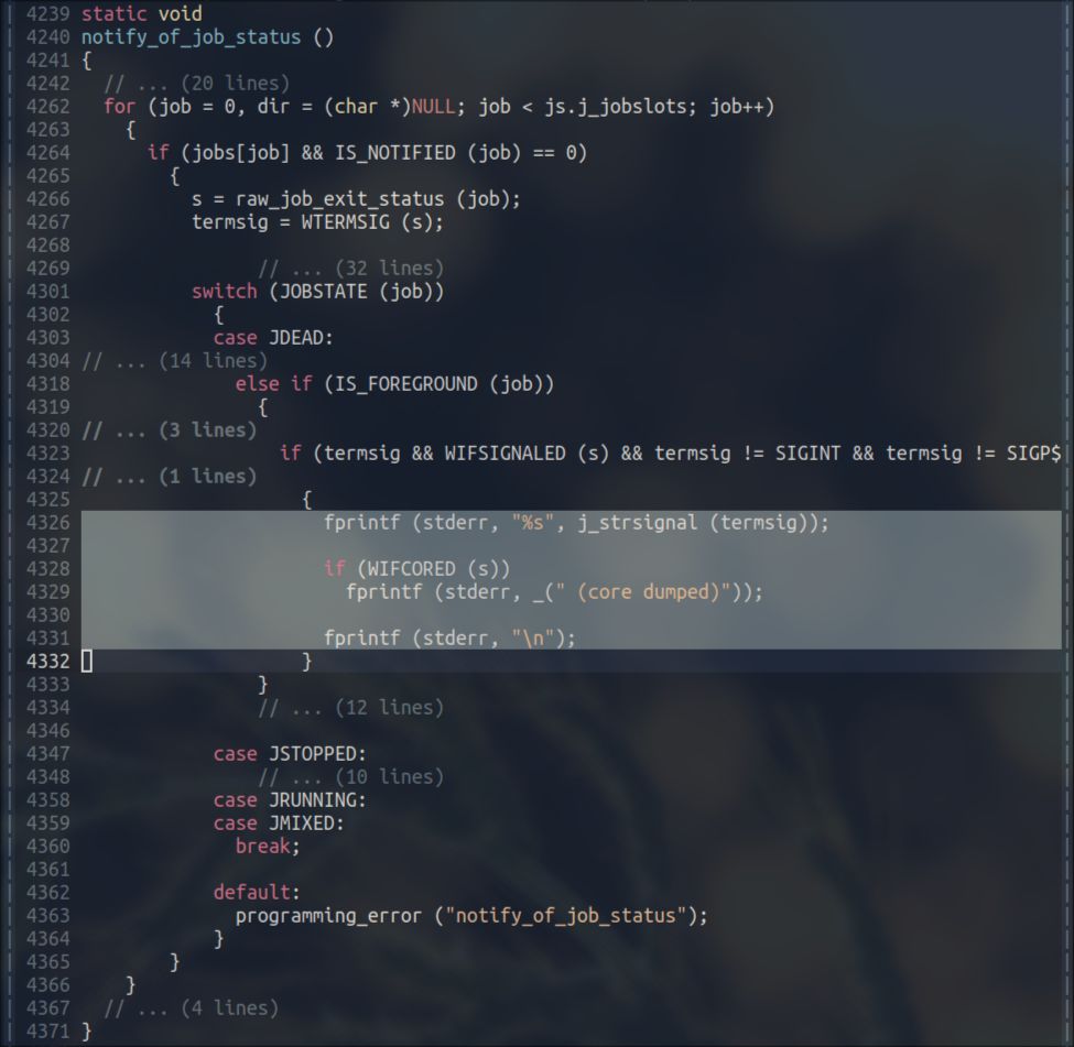 子进程在终止终止之后,bash主进程的waitpid函数就会返回,并且获取到子进程退出的原因,即被SIGFPE信号杀死,并且产生了core dump文件。