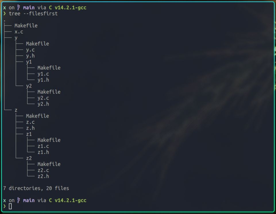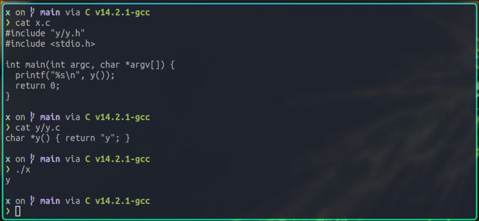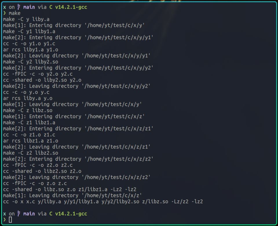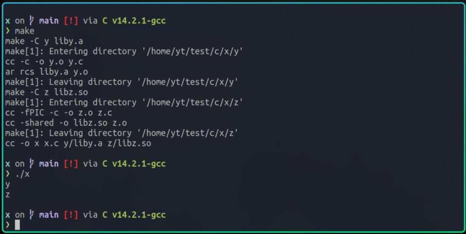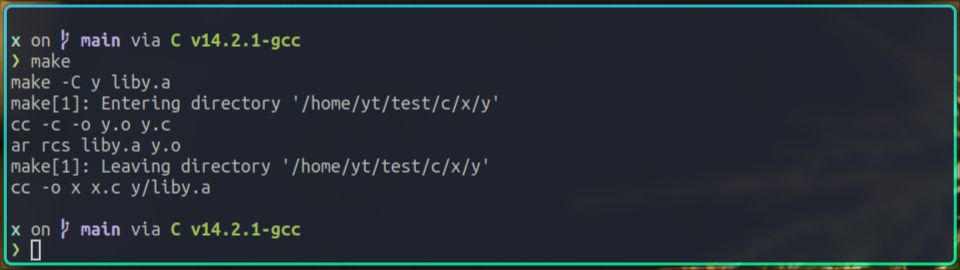 因为我已经提前编写好了对应的Makefile,所以可以直接执行make命令,来构建x和y项目:
