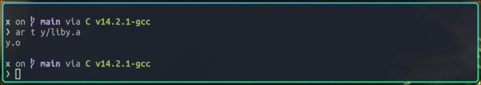 由上图可以看到,这次构建过程是先进入y目录,然后将y.c编译为y.o,然后再使用ar命令,将y.o打包为liby.a,这样y项目的静态库就创建好了。