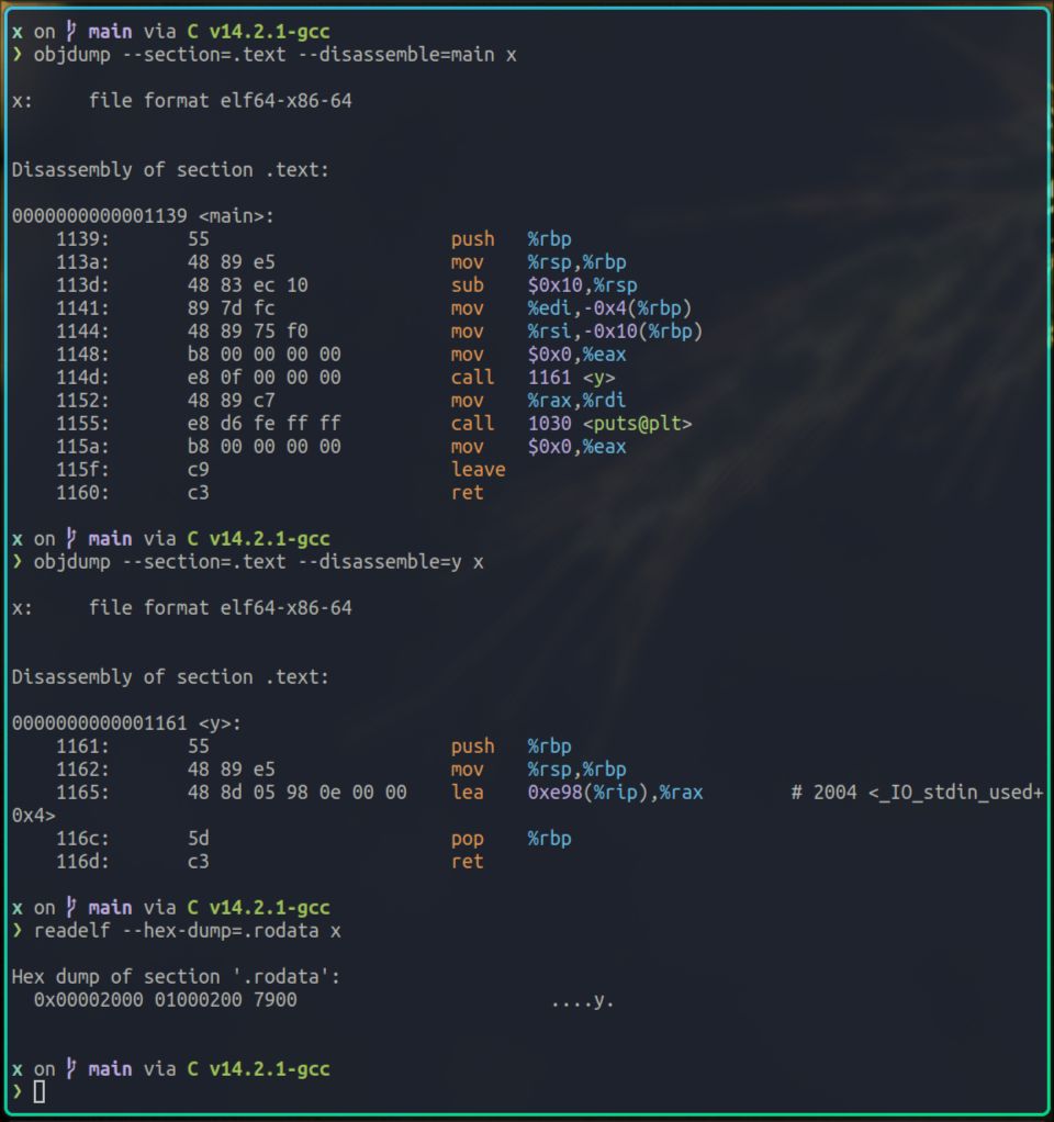 在c代码里,y函数是直接返回了一个常量字符串y,而这个常量字符串y,在编译后,是被存放到了x的.rodata这个section的2004位置。