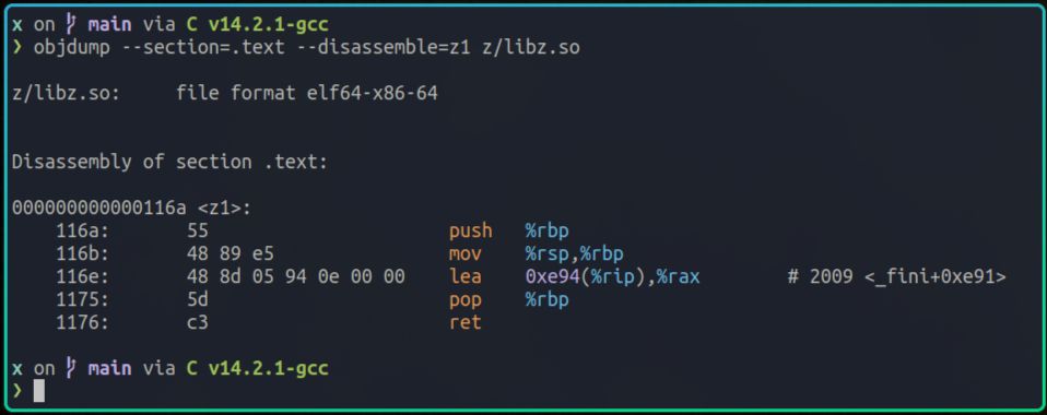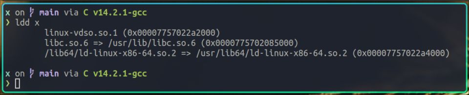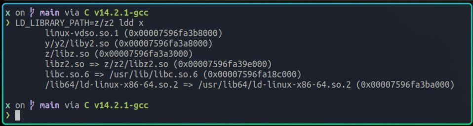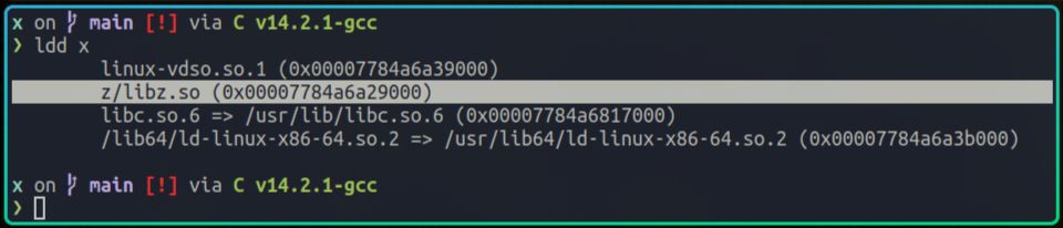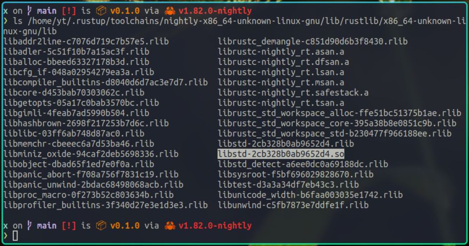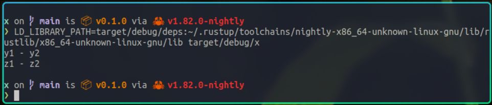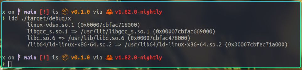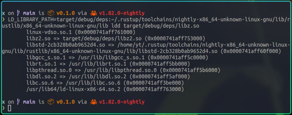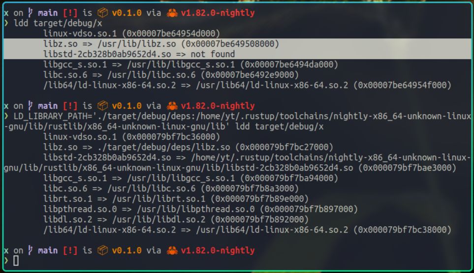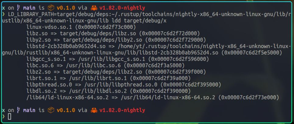 从ldd的输出我们可以看到,x在运行时依赖了很多动态库,比如我们自己编写的libz.so,rust的标准库libstd.so,以及c的标准库libc.so等。