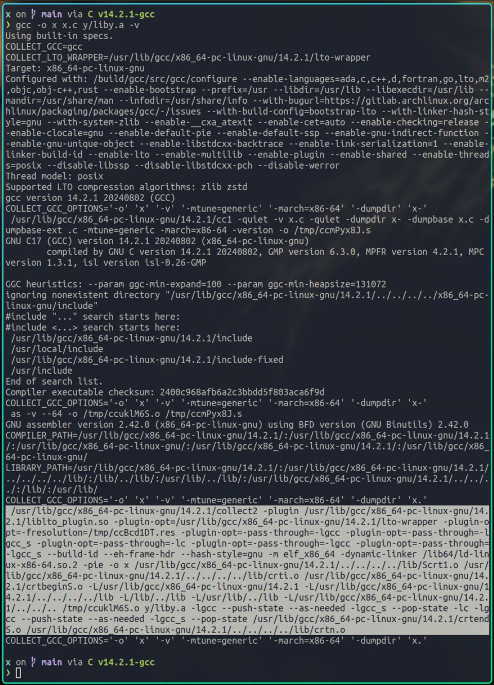 由上图中的选中行,我们可以获取很多信息,比如,x的dynamic linker被指定为了/lib64/ld-linux-x86-64.so.2,比如,x.c是先被编译成 /tmp/ccy2DBQ2.o,然后再参与链接过程,又比如,我们指定的liby.a这个静态库,也参与了此链接过程。