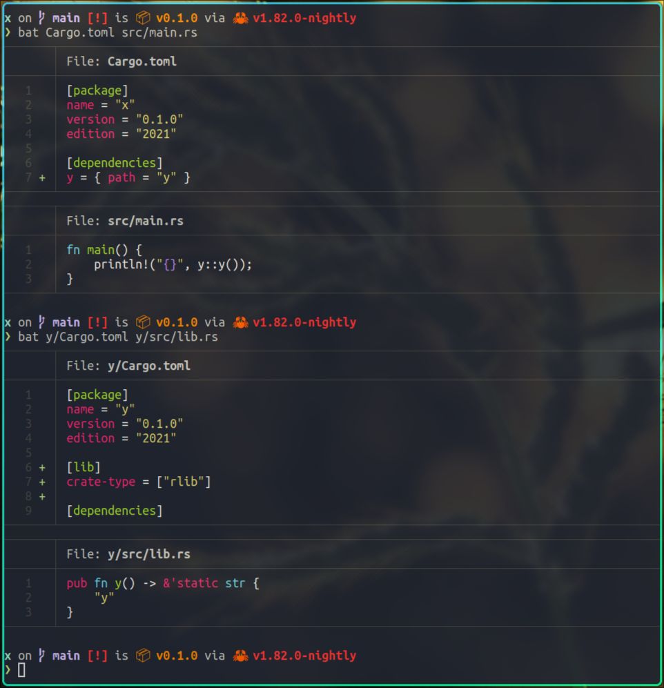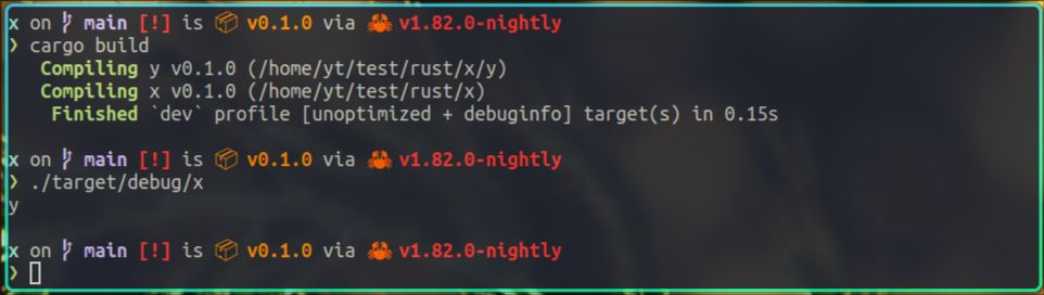 在x项目的Cargo.toml文件里,我们添加了其对y项目的依赖,在y项目的Cargo.toml文件里,我们将这个库的crate-type设置为rlib。