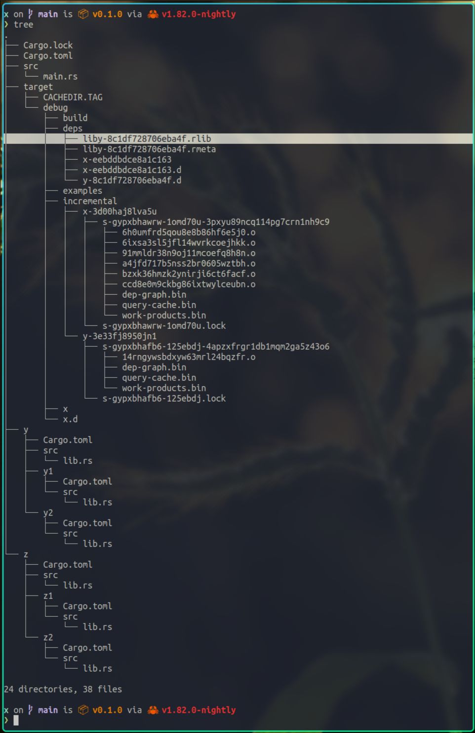 它里面有三个文件,lib.rmeta存放的是y库的描述信息,另外两个.o文件是y/src/lib.rs编译后的结果。