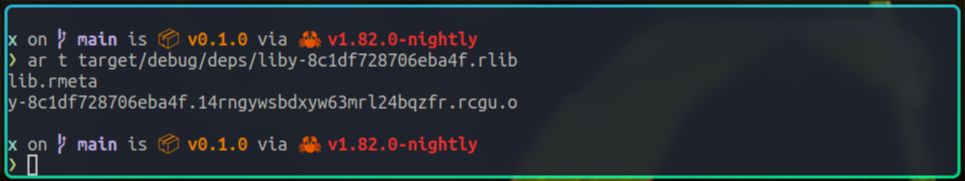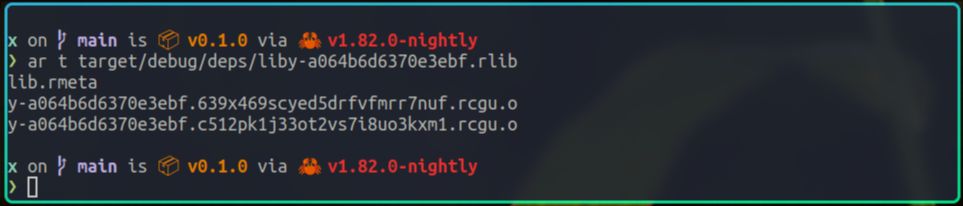 虽然它的扩展名是.rlib,但它本质上和.a一样,也是一个打包文件,我们依旧可以使用ar命令,查看它打包的内容: