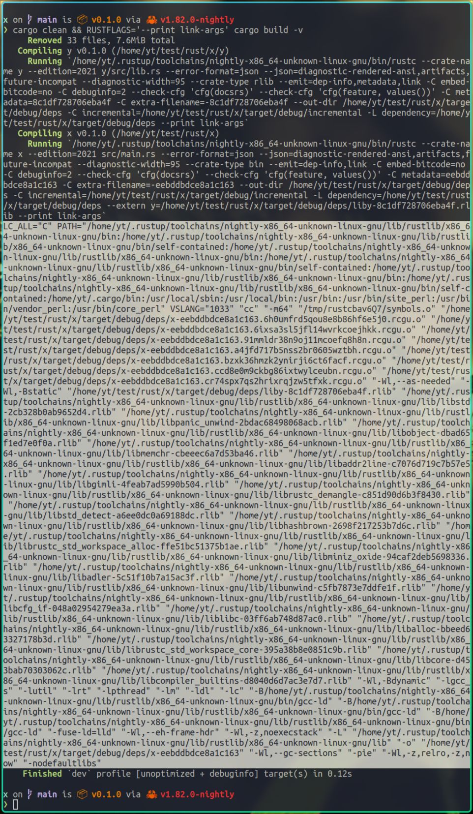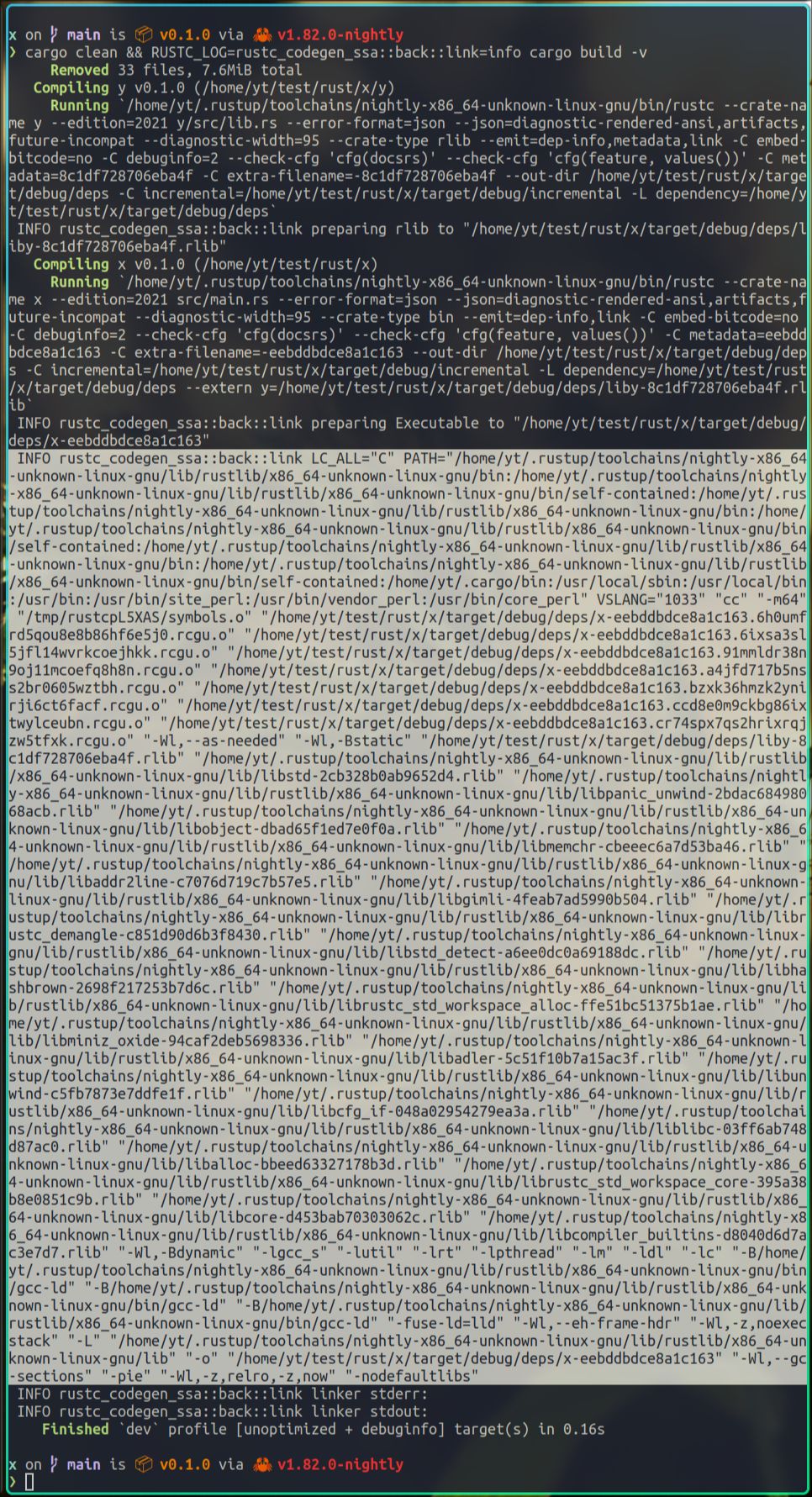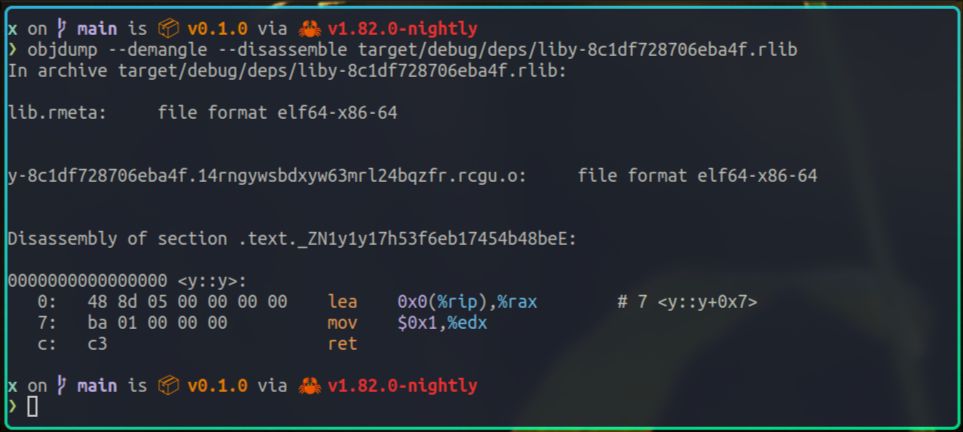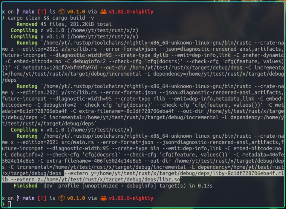上面的输出其实包含很多有用的信息,不过现在我们只看上图中的选中部分,它告诉rustc,将静态库liby.rlib,以及动态库libz.so,链接到x里。