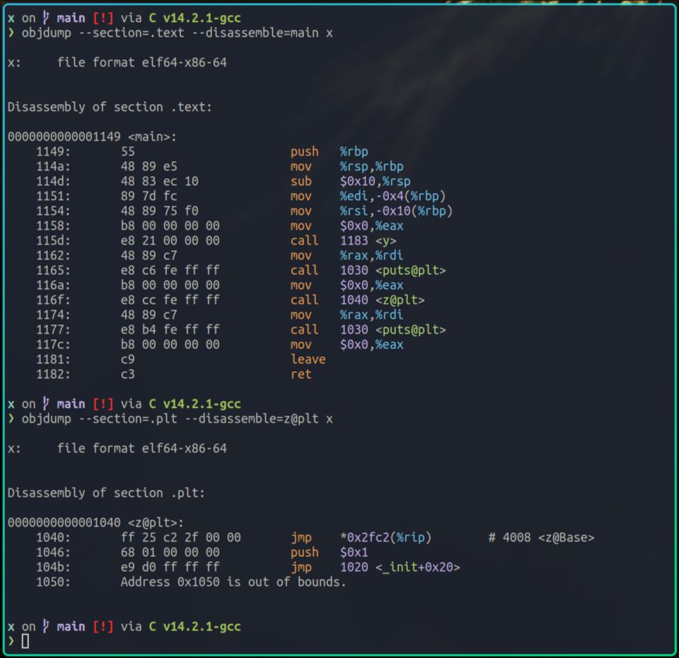 上图中,我使用objdump命令,查看x里的main函数,以及y函数的汇编代码。