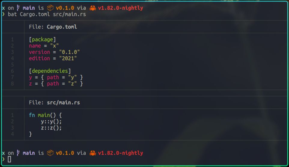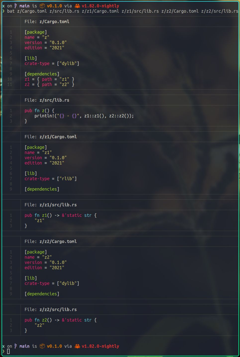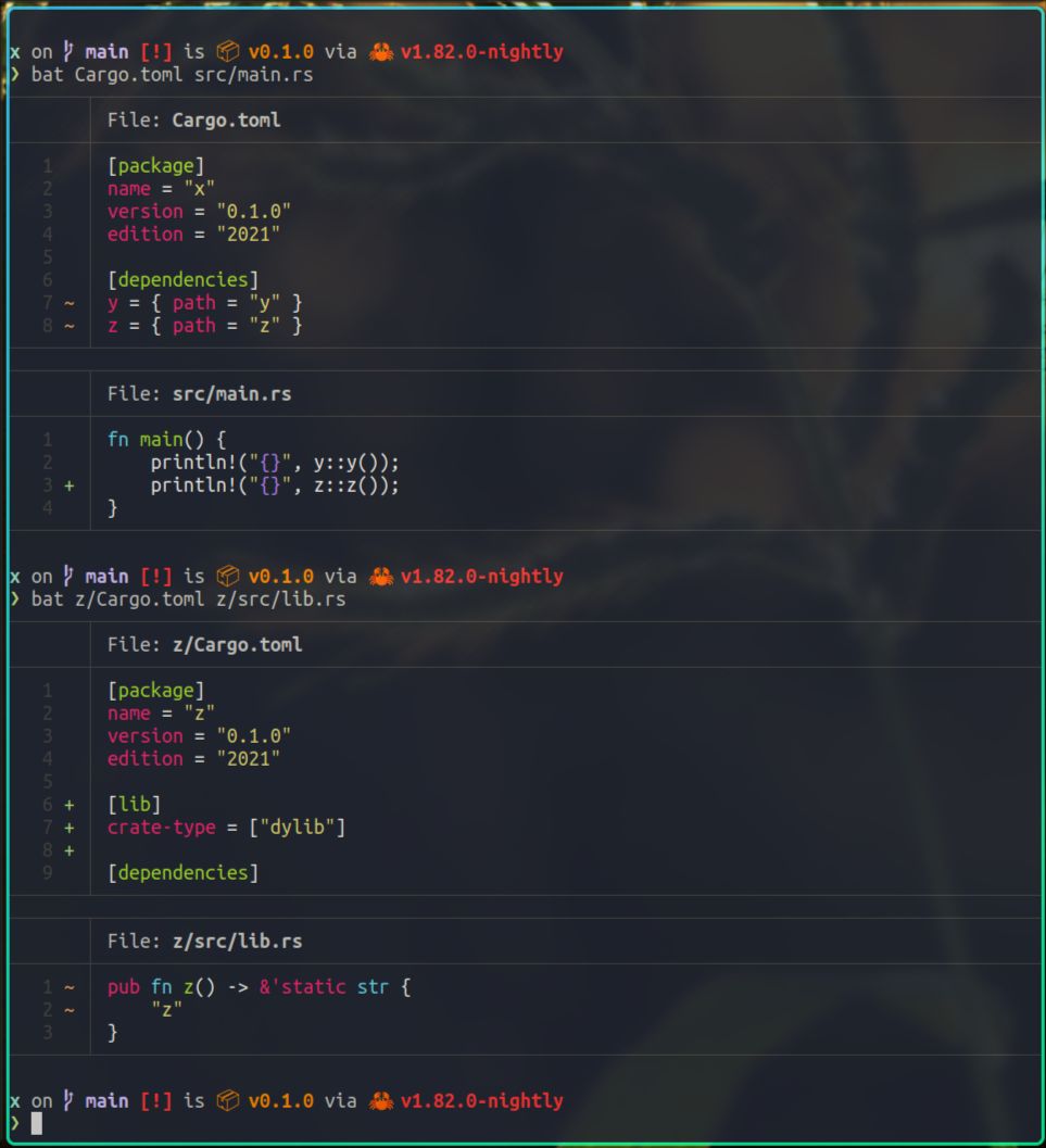 我们在x项目的Cargo.toml文件里添加了对z的依赖,在z项目的Cargo.toml文件里将crate-type设置为dylib,这一点是非常重要的。