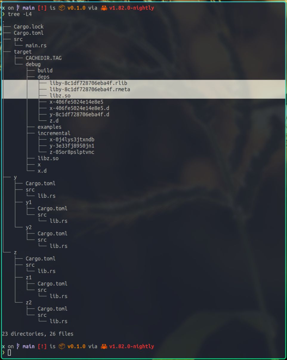 它运行时依赖 liby2.so, libz.so, libz2.so,而 liby.rlib, liby1.rlib, libz1.rlib,因为被静态链接到了对应的x以及libz.so里,所以x没有对它们的运行时依赖,这个和c语言是一样的。