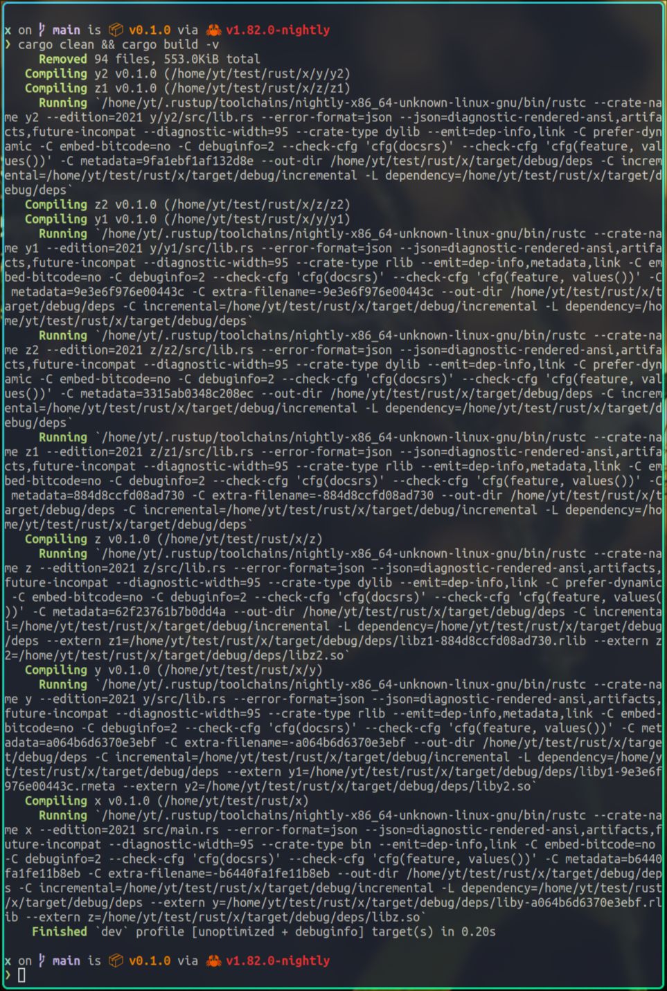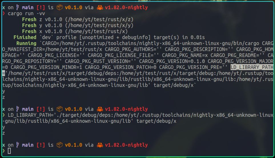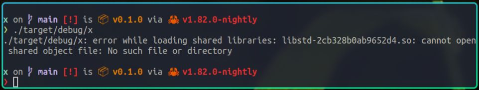 在执行cargo run时我添加了-vv参数,这样就能输出cargo底层,是如何执行x命令的,其中最主要的就是LD_LIBRARY_PATH环境变量的设置,这个环境变量就是在告诉dynamic linker,到这些目录里去找x依赖的动态库。