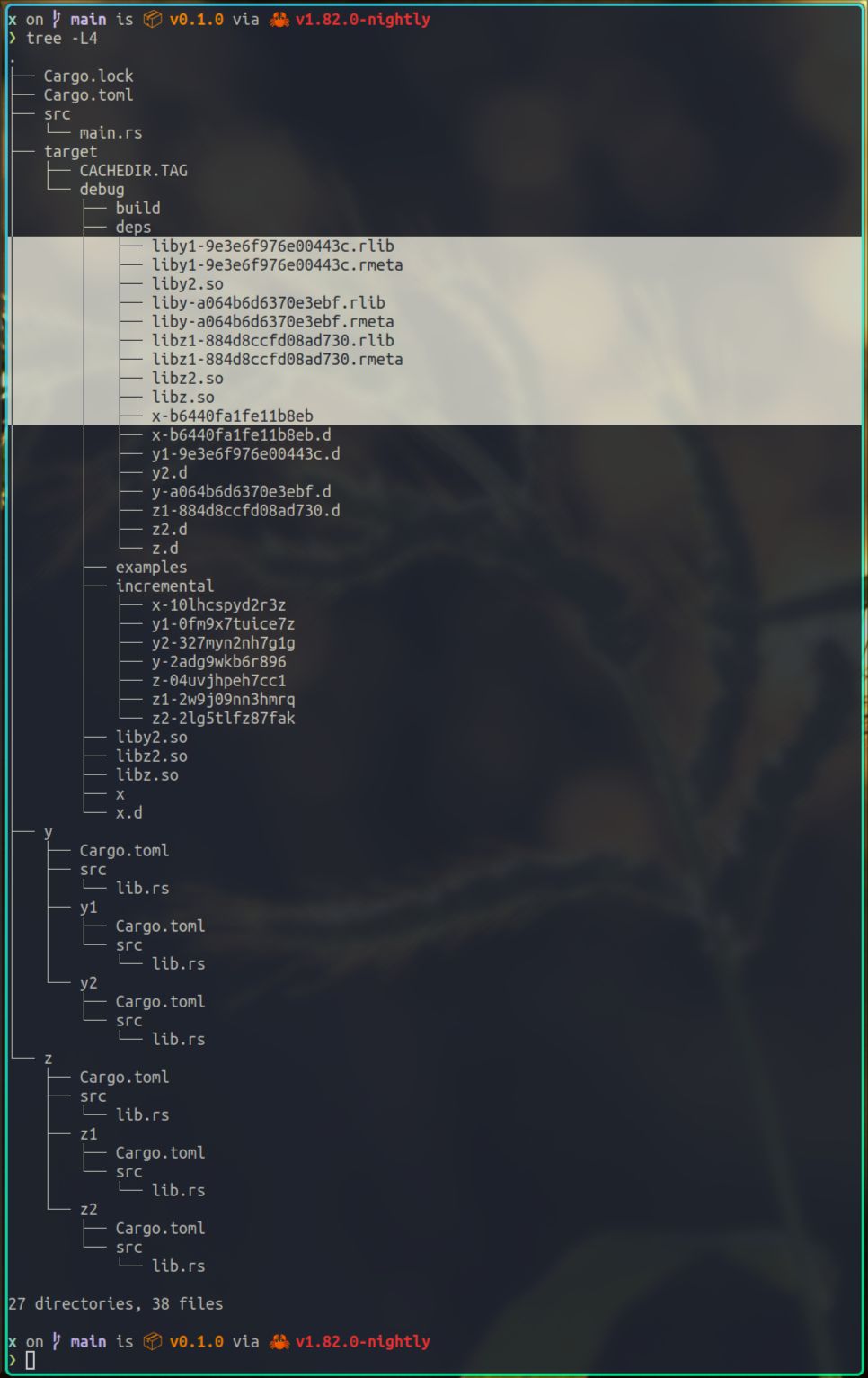 当我们把这个目录,以及libz.so所在目录target/debug/deps,添加到LD_LIBRARY_PATH环境变量之后,dynamic linker就可以在运行时,找到x依赖的这些动态库了,所以x就可以正常运行了,这个在上面我们也演示过了。