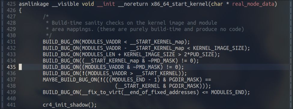 看上图中的 x86_64_start_kernel 函数,它就是大量使用了 BUILD_BUG_ON,在编译期检查各种条件是否符合预期。