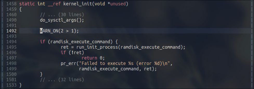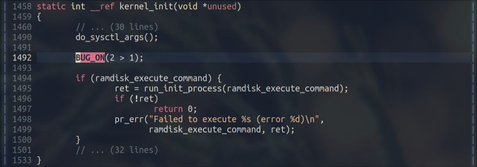 看图中的第二行,它就是说,在 init/main.c:1492 位置,产生了一个kernel bug,而这个位置,正是我们刚添加的BUG_ON代码的位置。