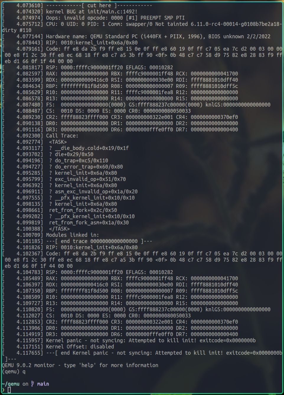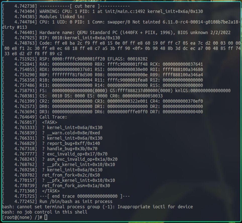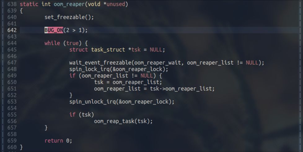 在此处加 BUG_ON,预期的效果是内核会尝试杀掉init进程。