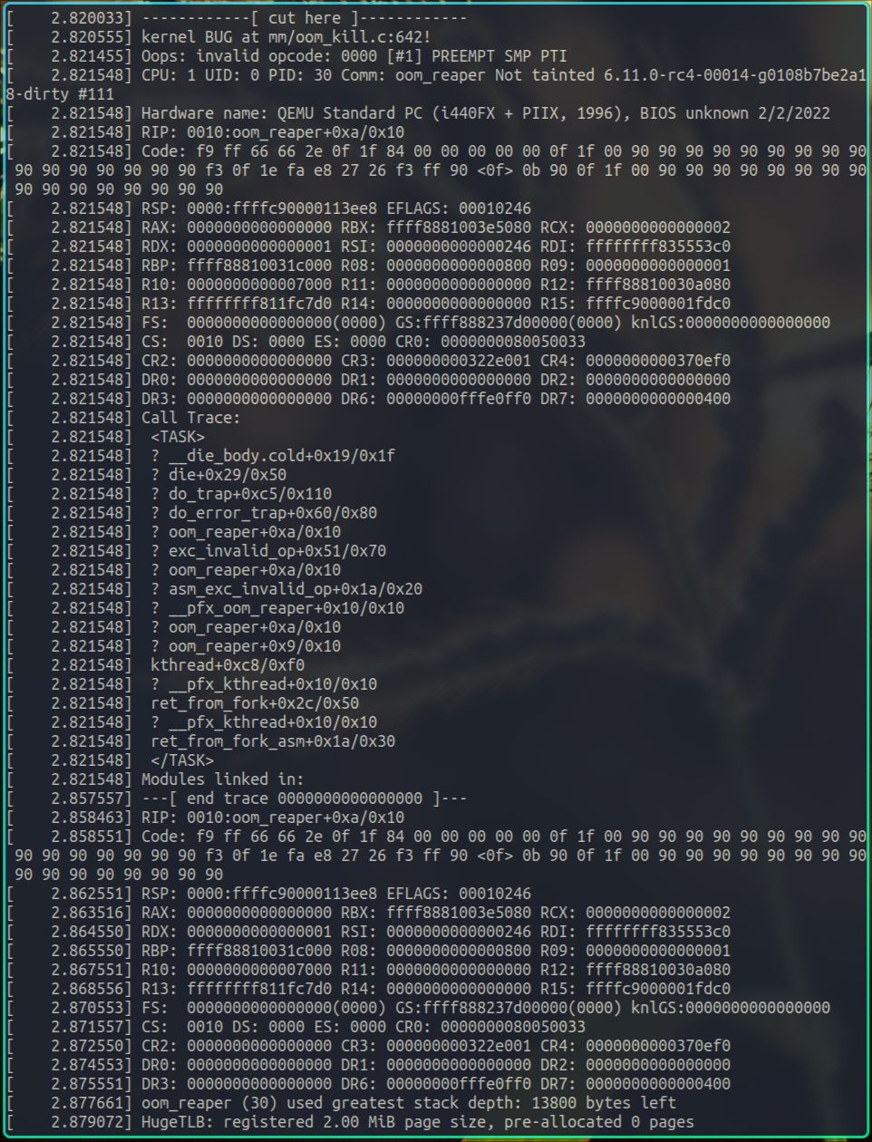 上图就是在oom_reaper进程里添加的BUG_ON,我们运行这个内核看下: