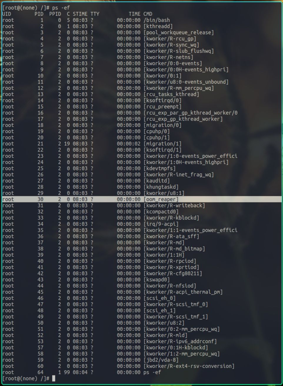 这次我们可以看到,oom_reaper进程被杀死了,且因为这个进程并不是特殊进程,所以并没有发生panic,内核是启动成功了的。