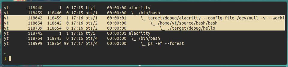 上图是用ps命令输出的信息,看图中的选中行,第一行为alacritty进程,即我们最开始启动的terminal emulator,第二行为alacritty启动的子进程,在该子进程中,运行的是bash程序,第三行为bash启动的子进程,在该子进程中,运行的是我们文章最开始时使用的测试程序hello。
