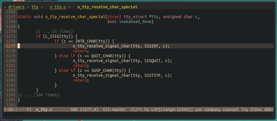 上图中,光标所在行就是在判断该字符是否是Ctrl-C,如果是,则发送SIGINT信号给目标进程。